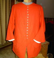 French regimental coat in oatmeal linen with scarlet bucket cuffs and domed brass buttons. Unlined, and used in the Americas in summer.