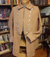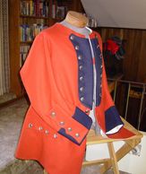 Standard off white wool justacorps with royal blue bucket cuffs and skirt linings, domed brass buttons on cuffs, pockets, and front. Shown with "turnbacks" fastened for deployment in the field.