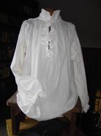 Man's shirt in white cotton. Unfitted shirt has square collar, narrow cuffs, and underarm gussets. It was made in cotton or linen, with a front slit either left plain or with a ruffle.