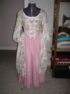 Lady's polonaised gown in ecru print with pink petticoat. The bodice closes with hook-and-eyes at center front, with satin ribbon accent bows. Sleeves are trimmed with lace flounces.