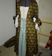 Full gown in patterned green with a full "sack back", shown over a teal petticoat. The sleeve flounces are attached, but the stomacher is omitted to show the front lacing.