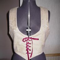 A "french bodice" in heavy tan fabric. The bodice laces closed in front, and comes to the waist at the back and sides, lowering to a point at center front.