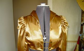 Spencer jacket in gold satin. Signature short jacket has long sleeves, a fold down collar and fastenes in front with two gold button/chain fasteners.