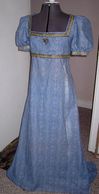 Ice blue satin empire waist gown with ecru crocheted lace at waist, hem and neckline.