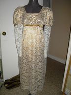 Lace gown over gold silk lining, with gold satin ribbon accents at waist and sleeve cuffs. Features detachable lace lower sleeves.