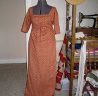 Bib-front day dress in rust cotton. Front closing with an "apron" front panel that ties under the bust. Elbow length sleeves.