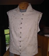 Silver/gray satin waistcoat with high regency collar. Sleeveless, cut straight across at the waist, with two welt pockets.